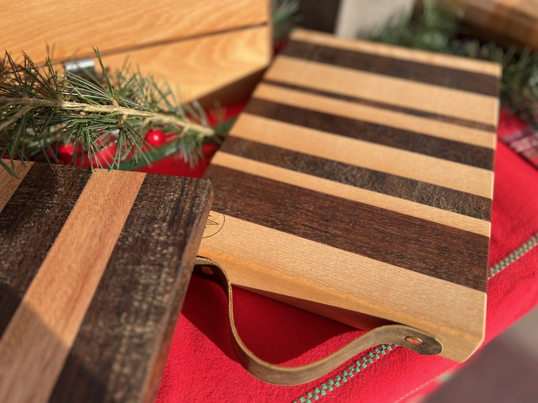 L’ampio spessore e l’utilizzo di legni duri lo rendono un tagliere adatto a qualsiasi lavorazione. La presa è realizzata con dei manici in “vera pelle” il che lo rendono un’elegante complemento di arredo adatto a servire salumi e formaggi.